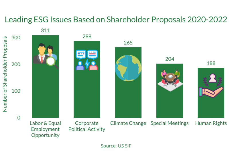 For the period of 2020-2022, climate change ranked third based on the number of shareholder proposals filed. Labor & equal employment opportunity came in first, followed by corporate political activity.